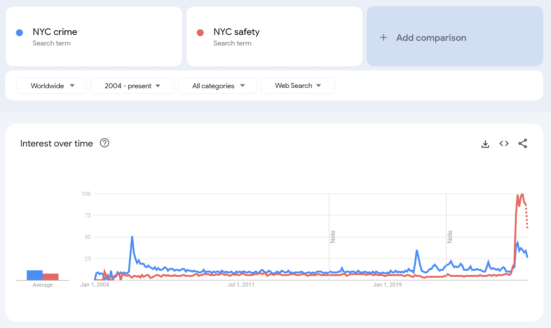 Public concern about New York City’s street safety has surged to its highest level in two decades. According to Google Trends, searches for “NYC crime” and “NYC safety” spiked ten‑fold in mid‑2025 and have remained at this elevated level ever since. SafeAreasNYC.com is the first independent response to this unprecedented public demand for granular, honest, street‑level data.